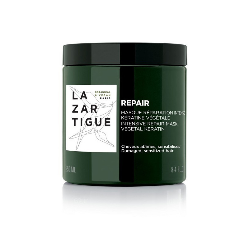 Lazartigue Máscara Reparadora é um cuidado reparador à base de queratina vegetal e ácido hialurónico botânico. Repara os danos profundos e reestrutura os cabelos em profundidade. Reforçado e consolidado por dentro, o cabelo fica mais forte, macio e sedoso. Sem sulfato e sem silicone. Fórmula vegan.