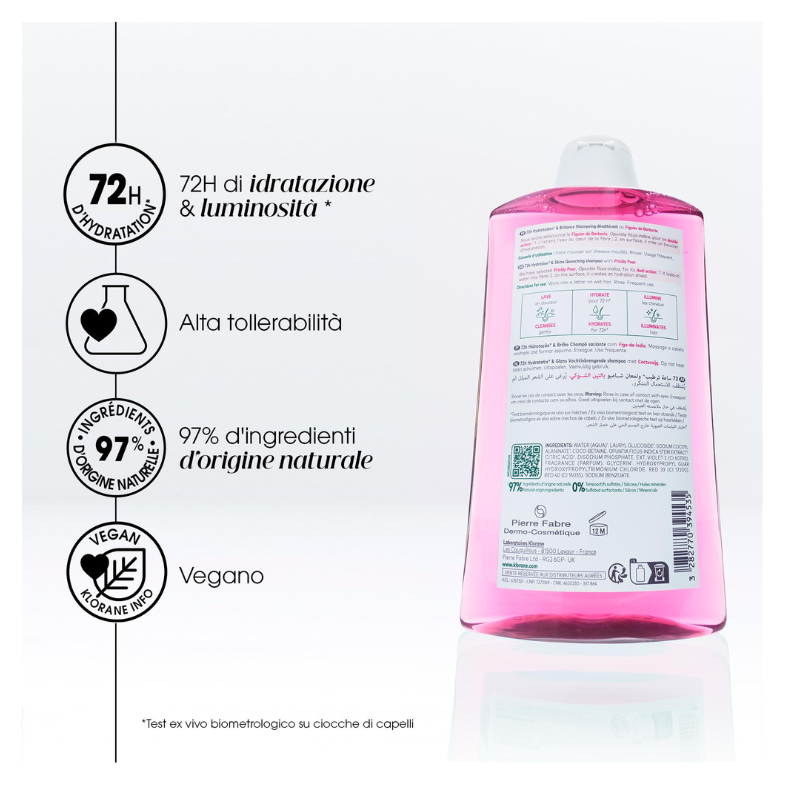 - Formulado com 97% de ingredientes de origem natural, este champô com Figo da Índia, que possui propriedades hidratantes superiores às da glicerina devido às suas moléculas hidro fixadoras, hidrata eficazmente e devolve o brilho ao cabelo sem pesar.