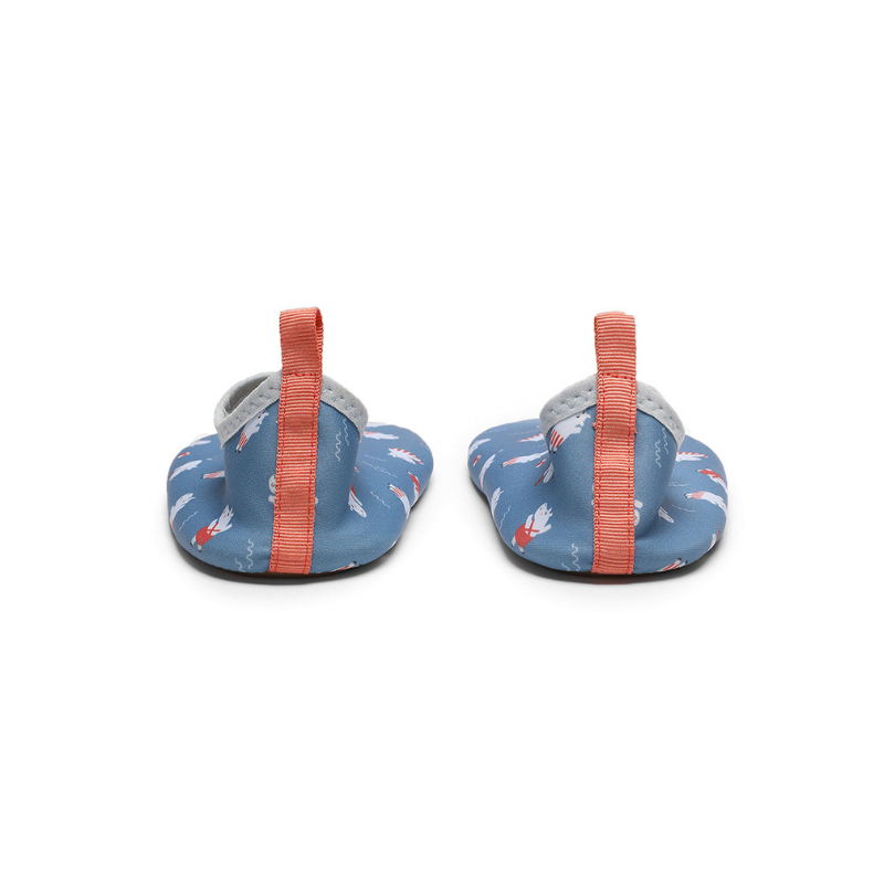 Sapatinhos de praia tamanho T22/23 (14 cm). Proteção UV50+, tecido macio (95% poliéster Oeko-Tex, 5% elastano). Sola EVA antiderrapante. Lavável à máquina. Ideal para praia e piscina.