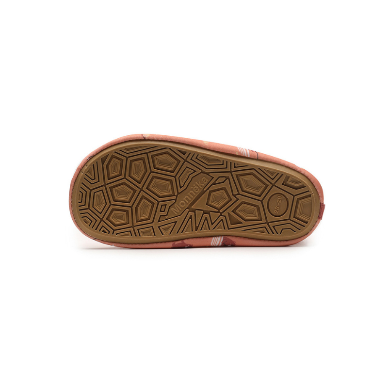 Sapatilhas de lona infantis Monnëka, design barefoot com drop zero, sola larga e flexível. Fecho em velcro, palmilha removível. 100% algodão respirável. Lavagem em água fria.