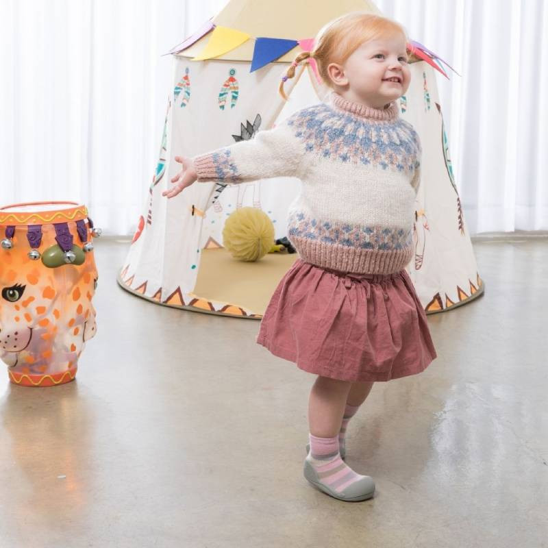 Attipas Pom Pom Pink é um sapato de bebé barefoot e ergonómico projetado com base em uma meia e uma sola antiderrapante que se ajusta completamente ao pé do bebé como se fosse uma segunda pele.