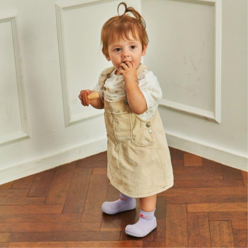 Attipas Frill Rose é um sapato de bebé barefoot e ergonómico projetado com base em uma meia e uma sola antiderrapante que se ajusta completamente ao pé do bebé como se fosse uma segunda pele.