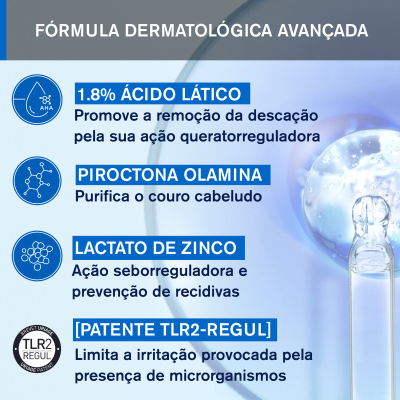 Formulado com Água Termal dos Alpes Franceses, esta inovação da Uriage alia o poder purificante e esfoliante do Ácido Lático à ação calmante da tecnologia patenteada TLR2-Regul e do extrato de Edelweiss. A presença de Piroctona Olamina e Lactato de Zinco ajuda a controlar o excesso de Malassezia, principal responsável pela descamação e irritação.