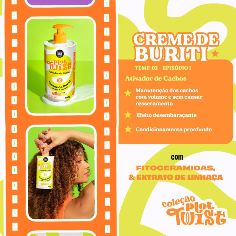 Lola Plot Twist Buriti Creme Ativador é ideal para cabelos crespos e cacheados. Define, modela, controla o frizz e hidrata profundamente, deixando os fios macios, com brilho e volume natural.