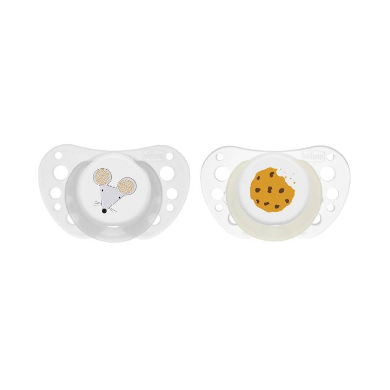 Chicco Chupetas Physio Air Silicone Rato/Bolacha 16-36M fabricadas em silicone suave com escudo rígido e forma ergonómica.