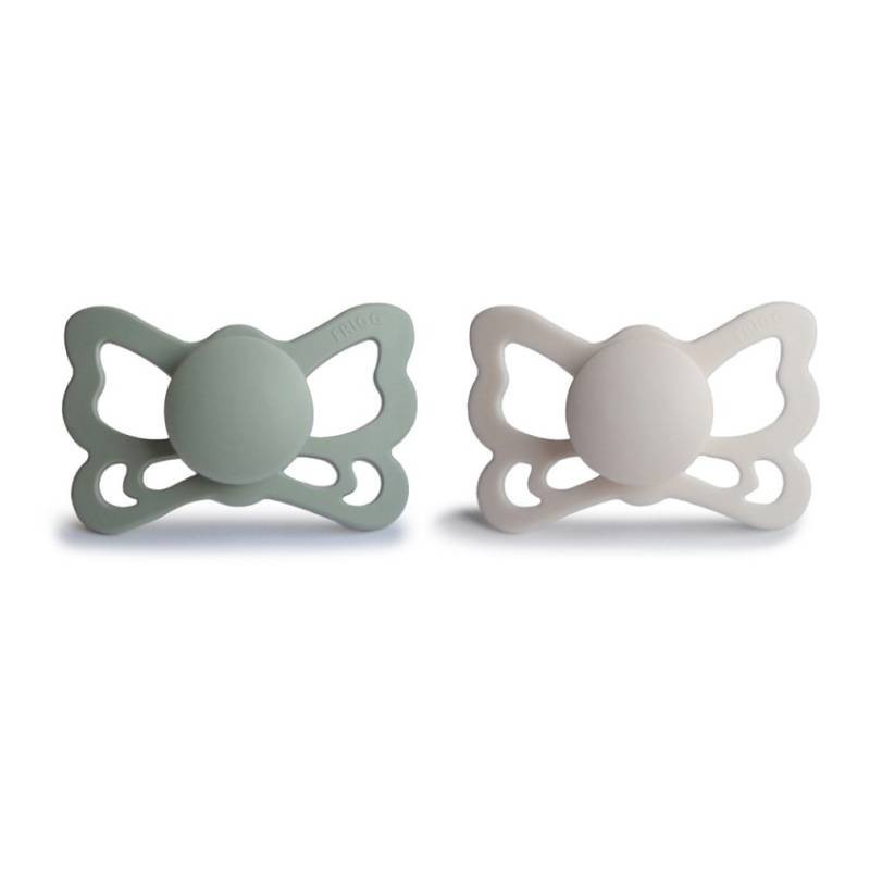 Frigg Butterfly Chupetas Silicone Sage e Silver Gray 6-18M é um pack composto por duas chupetas de silicone, indicadas para bebés entre os 6 e os 18 meses.