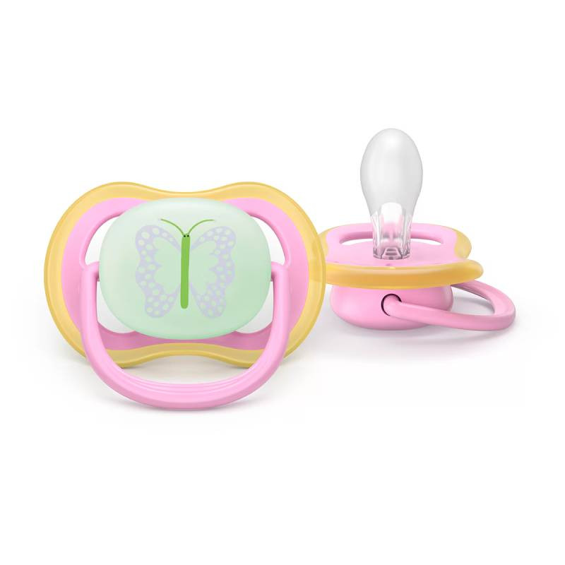 Chupeta Philips Avent Ultra Air: Conjunto de 2 chupetas para bebés dos 6 os 18 meses. Tetina ortodôntica extra firme para alívio da dentição, escudo com orifícios respiráveis e 80% materiais de origem vegetal. Inclui caixa esterilizadora ecológica.