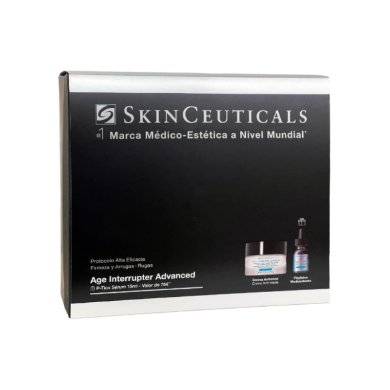 Coffret Skinceuticals Firmeza e Rugas com AGE Interrupter Advanced 48ml + P-Tiox 15ml oferta. Neutraliza a glicação e protege contra radicais livres. Tratamento antienvelhecimento avançado. Edição Natal.