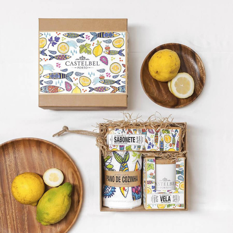 Castelbel Sardinha Coffret é composto por um pano, uma vela e um sabonete, o presente original para qualquer cozinha.