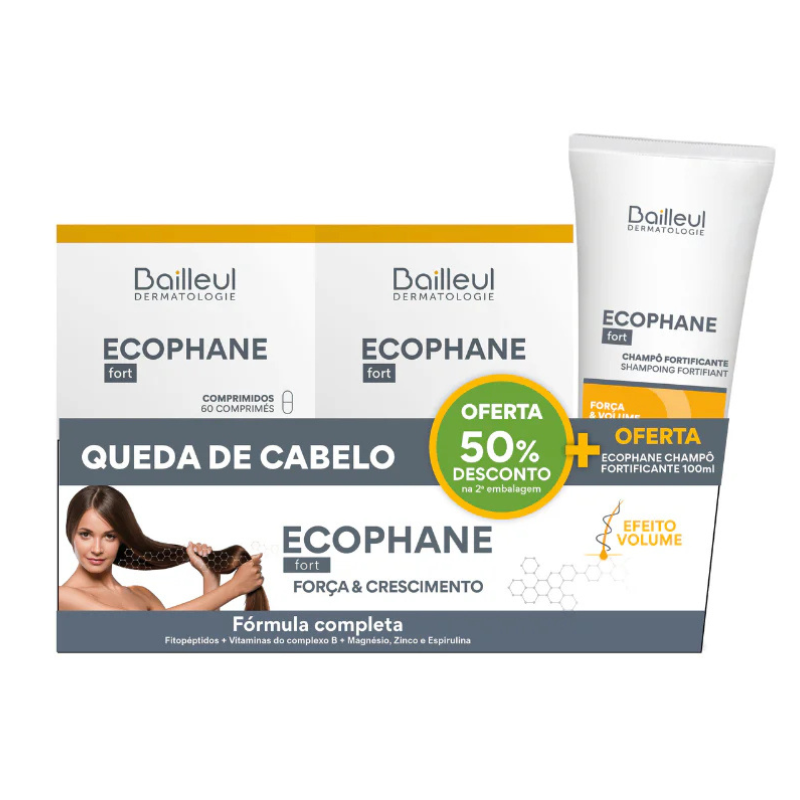 Ecophane Fort Comprimidos é um suplemento alimentar que contém uma fórmula muito completa, com fitopétidos, ricos em cistina e metionina, vitaminas do complexo B, minerais e espirulina, destinado à queda de cabelo.