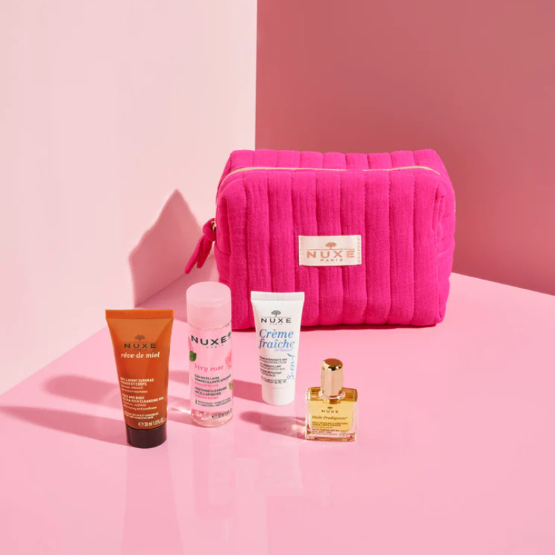 Viaja com elegância e vive uma experiência sensorial única com esta seleção de cuidados Nuxe em formato prático para viagem: