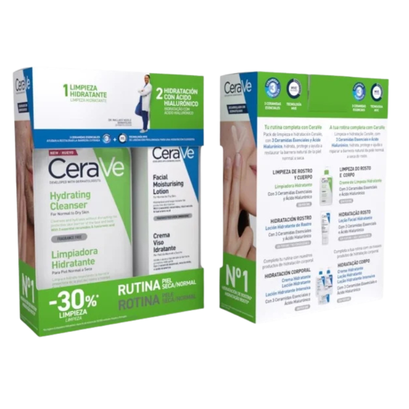 O Pack Rotina Cerave oferece dois produtos essenciais para uma limpeza eficaz e hidratação profunda da pele. Inclui o Creme de Limpeza 473ml, ideal para remover impurezas e maquilhagem, e a Loção Facial 52ml, que hidrata e protege a pele.