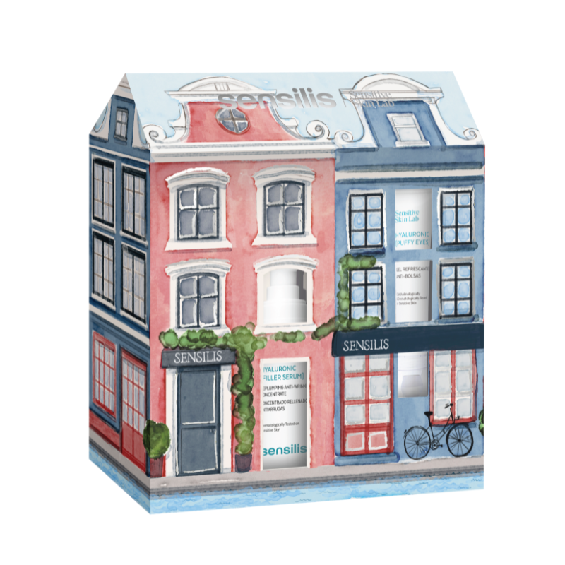 Sérum preenchedor com ácido hialurónico 30ml + creme para olhos 15ml. Embalagem especial em forma de casa. O presente ideal para preencher rugas e revitalizar o olhar.