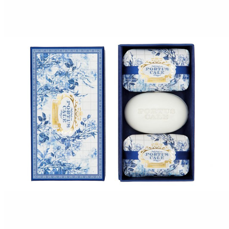 Cada um dos três sabonetes de 150g é uma obra de arte individual. Cunhados e embalados à mão pelas artesãs Castelbel, são envolvidos num papel que reinterpreta motivos florais clássicos dos azulejos portugueses, com elegantes detalhes dourados sobre um fundo azul profundo – uma homenagem ao nome "Portus Cale".