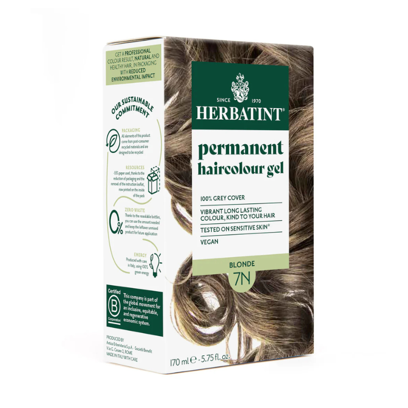 Herbatint 7N Louro Claro Natural: Coloração permanente sem amónia com 100% de cobertura dos brancos. Tom louro claro puro e natural da série N. Fórmula suave para pele sensível. Aplicação fácil em gel que não escorre. Inclui Royal Conditioner para brilho intenso. Resultado em 40 minutos. Vegan.
