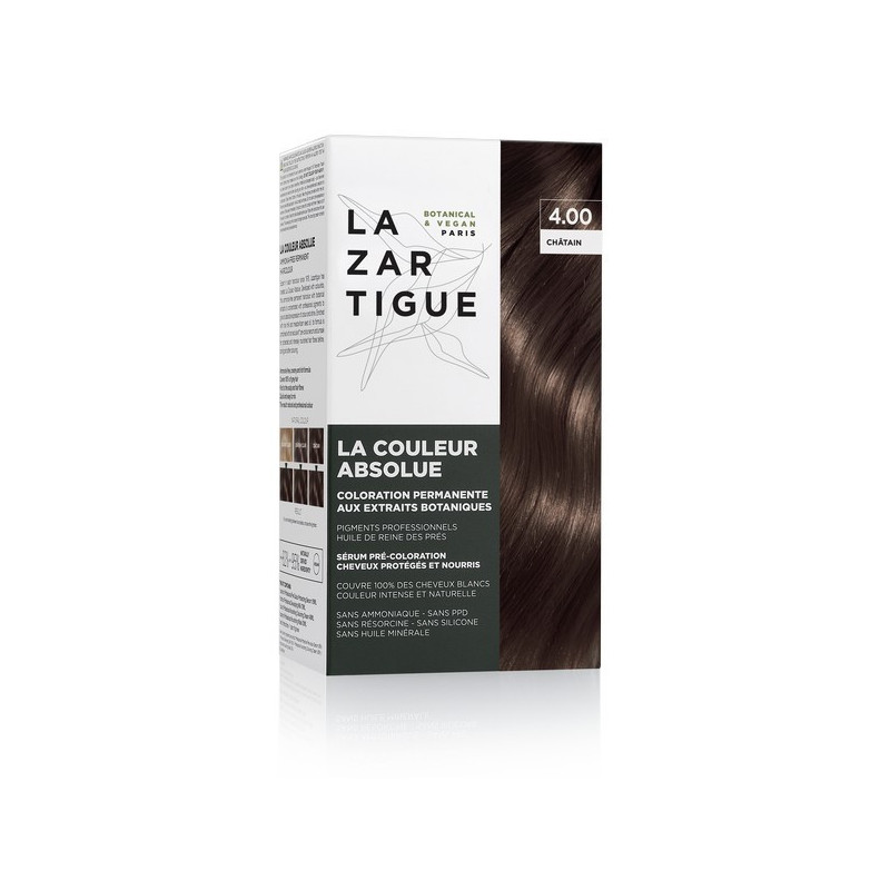 Lazartigue Coloração Permanente, é cuidado de cor capilar, indicado para todos os tipos de cabelo. É composto por: sérum profissional pré-coloração (15 ml); frasco com leite de cuidado profissional (70 ml); creme de coloração profissional (48 ml); máscara nutritiva profissional (20 ml); e um par de luvas.