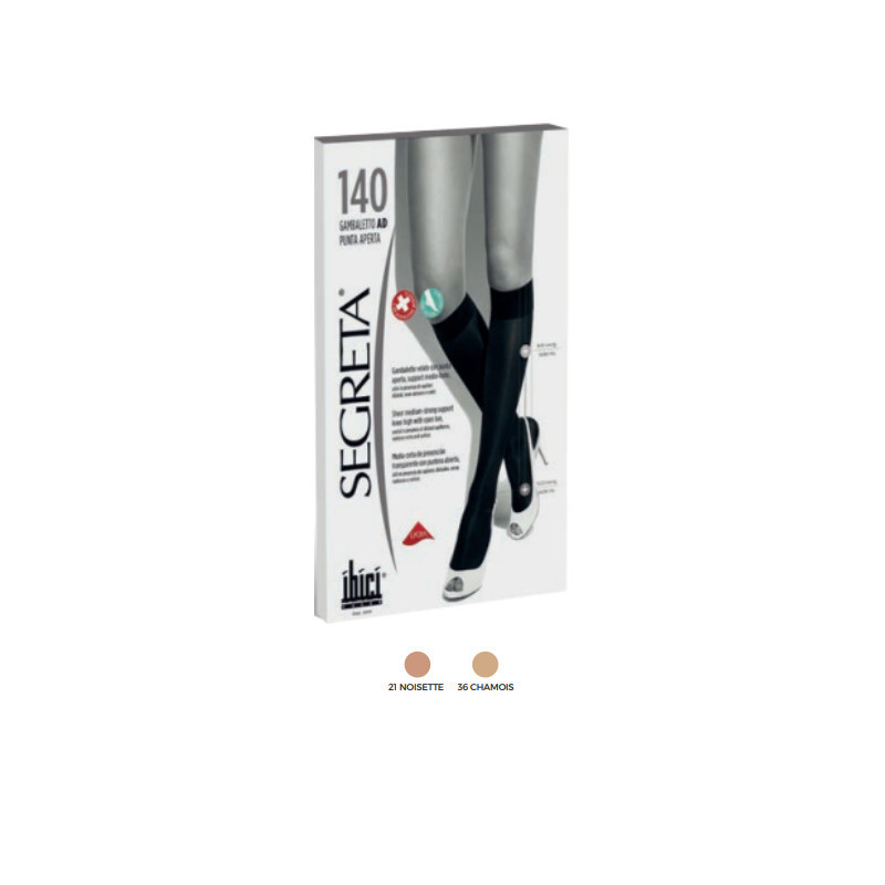 Íbící Segreta Meia AD 140 Ponta Aberta é uma meia elástica até ao joelho, transparente, com a ponta aberta e com compressão forte 140 DEN, indicada para mulheres entre os 30 e 60 anos que necessita de prevenir e controlar as pernas pesadas e cansadas e usa calçado aberto à frente ou sandálias.