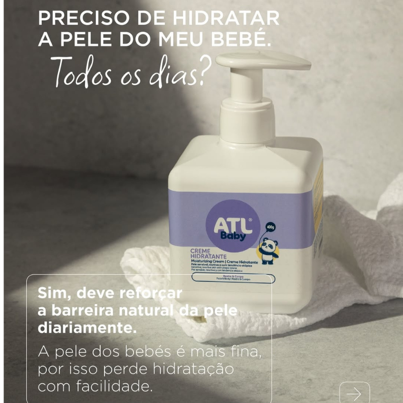 O ATL Baby Creme Hidratante foi criado para a pele delicada do teu bebé. Com uma fórmula de absorção rápida e não gordurosa, hidrata, protege e acalma a pele seca e muito sensível, mesmo com tendência atópica. Veste-o imediatamente após a aplicação!