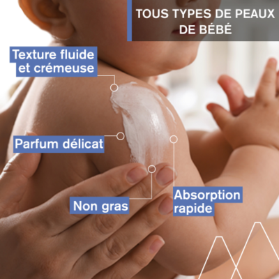 - Enriquecido com Manteiga de Karité e Esqualano Vegetal, promove o conforto, nutre e protege a pele delicada do bebé da secura.