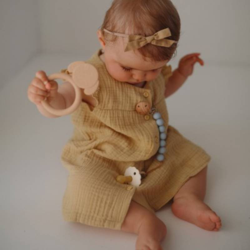 Mushie Corrente de Chupeta Halo é uma corrente feita de silicone macio e madeira natural, indicada para prender a chupeta, mantendo-a sempre limpa e perto do bebé.