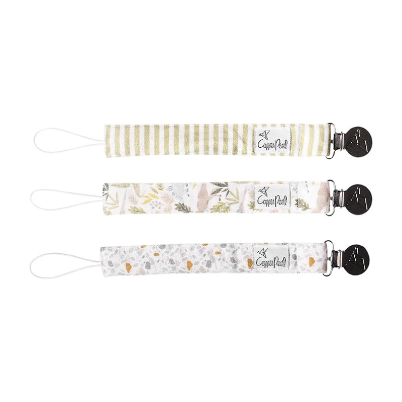 O set Autumn da Copper Pearl inclui 3 clipes para chupeta práticos e estilosos, ideais para evitar quedas e chupetas perdidas. Com pinça resistente em aço inoxidável e correia flexível premium, adaptam-se a praticamente qualquer chupeta, incluindo modelos maiores.
