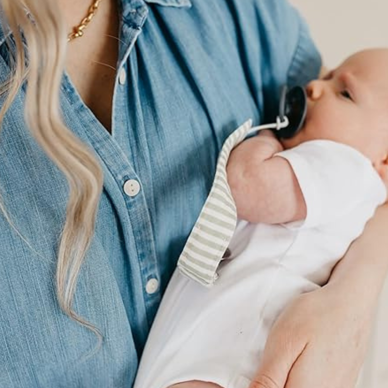 Cada clipe possui uma pinça em aço inoxidável robusta, que prende firmemente à roupa sem danificar, e uma correia flexível em borracha premium, compatível com praticamente qualquer chupeta, incluindo modelos maiores ou de marcas específicas.