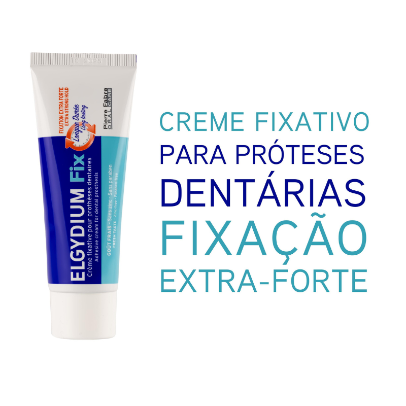 O Elgydium Fix Fixação Extra Forte proporciona uma fixação duradoura para próteses dentárias, mantendo-as seguras ao longo do dia sem necessidade de reaplicação.