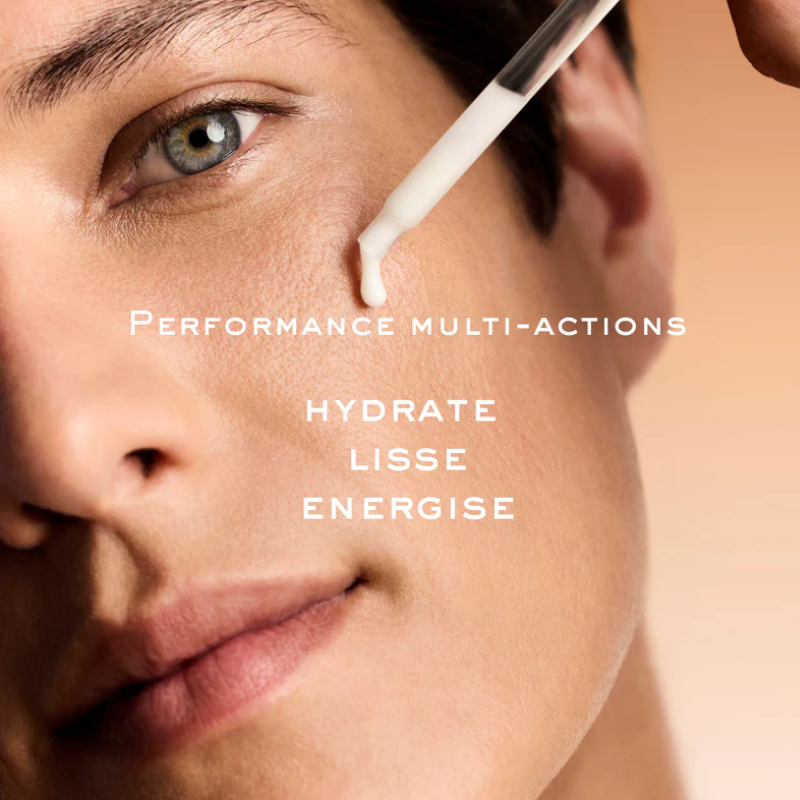 NUXE Men Boost Sérum multifunção com tecnologia ALFA [3R] (mais eficaz que retinol) e oléo-extrato de frêne. Revitaliza, regenera e preenche rugas. Textura fluida que não é gordurosa nem pegajosa.