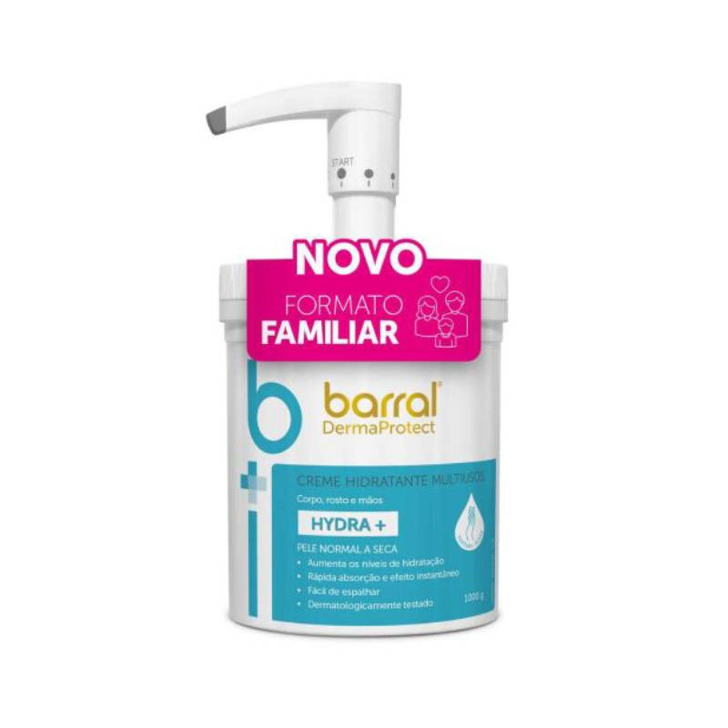 Barral Dermaprotect Hydra+ Creme Hidratante Multiusos 1Kg aumenta os níveis de hidratação do corpo, rosto e mãos de toda a família.