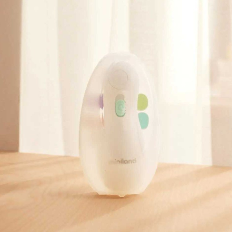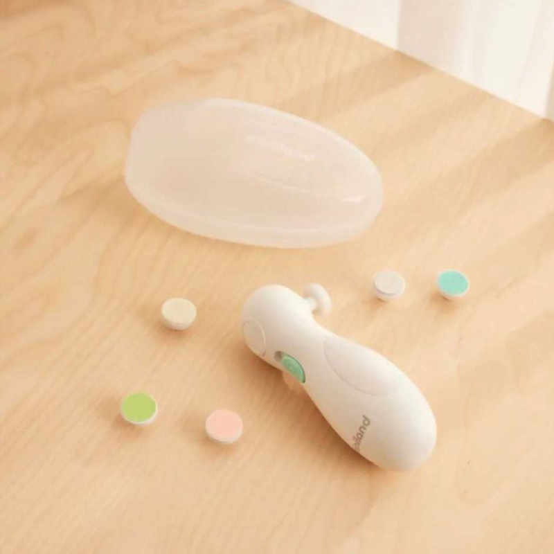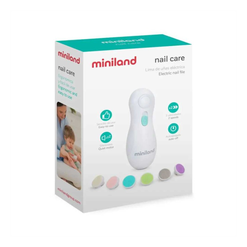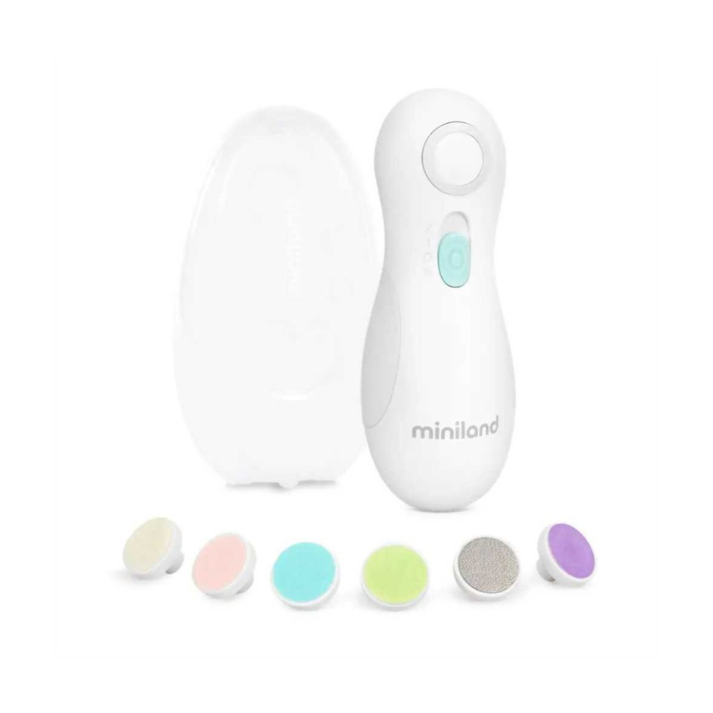 Lima elétrica Miniland para unhas de bebé, crianças e adultos. Inclui 6 cabeças, 2 velocidades e paragem automática de segurança. Funcionamento silencioso, prática e portátil. Ideal para um corte fácil e sem stress.