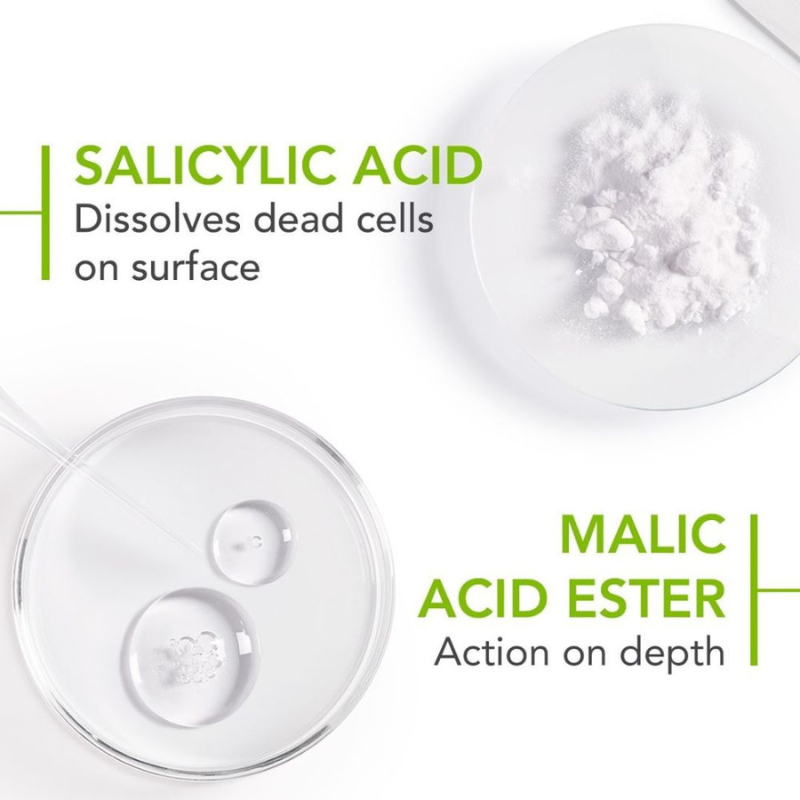 O exclusivo DUO DE ATIVOS QUERATOLÍTICOS (ácido salicílico e éster de ácido málico), eficiente no pH da pele, atua na superfície e em profundidade na pele para eliminar imperfeições e marcas, preservando o conforto da pele;
