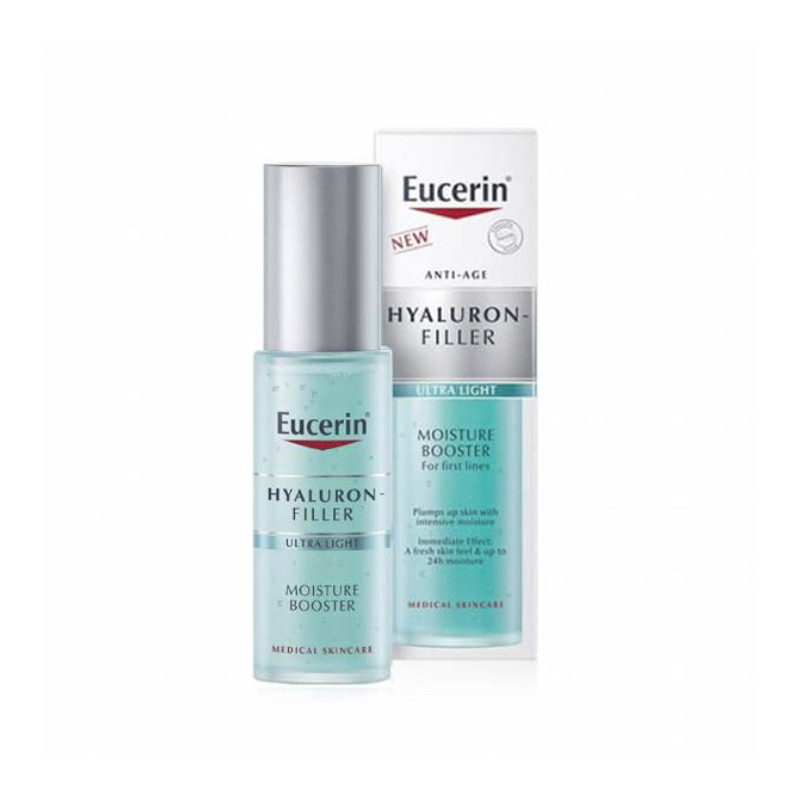 Eucerin Hyaluron-Filler Booster é um cuidado de rosto para as primeiras rugas, indicado para todos os tipos de pele, mesmo as mais sensíveis. A sua fórmula contém: Ácido Hialurónico de elevada concentração; com ação hidratante; Glicerina, que preenche as primeiras rugas. A Pele fica hidratada intensivamente e com aspeto mais saudável. Rápida absorção com textura suave. Confere luminosidade e suavidade ao rosto. Não comedogénico.