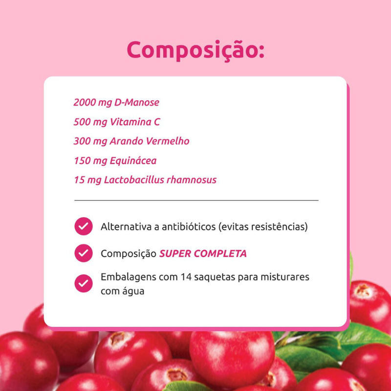 D-Manose, Vitamina C, Arando Vermelho, Equinácea e Lactobacillus rhamnosus.