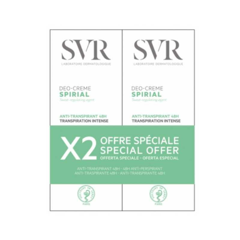 SVR Spirial Deo-Creme Antitranspirante Duo Preço Especial é um pack composto por duas embalagens de 50ml. SVR Spirial Deo-Creme Antitranspirante é um creme antitranspirante, indicado para todos os tipos de pele.