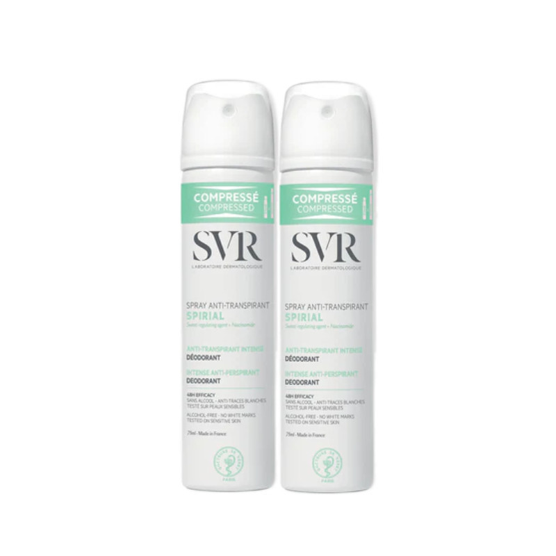 SVR Spirial Spray Deo Duo Preço Especial é um pack composto por duas embalagens de 75ml. SVR Spirial Spray Deo é um desodorizante antitranspirante intensivo 48 horas antiodor e anti-humidade.