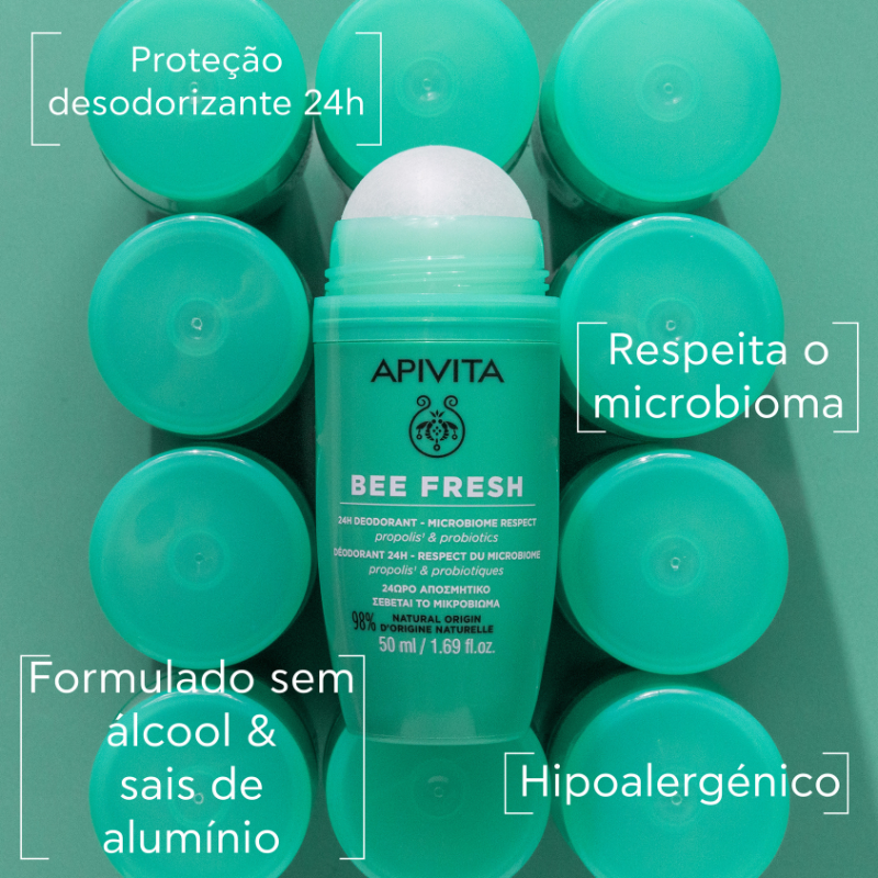 Formulado com própolis, probióticos patenteados e hamamélis, garante 24h de proteção, acalma a pele sensível, hidrata e suaviza as axilas. Ideal para homens e mulheres.