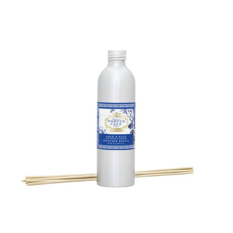 Castelbel Portus Cale Gold & Blue Difusor Recarga 250ml é uma embalagem em formato recarga compatível com o difusor Castelbel Portus Cale Gold & Blue graciosamente fresco e elegantemente floral, o aroma desta fusão de Pimenta Rosa e Jasmim, um perfume único que encanta os sentidos.