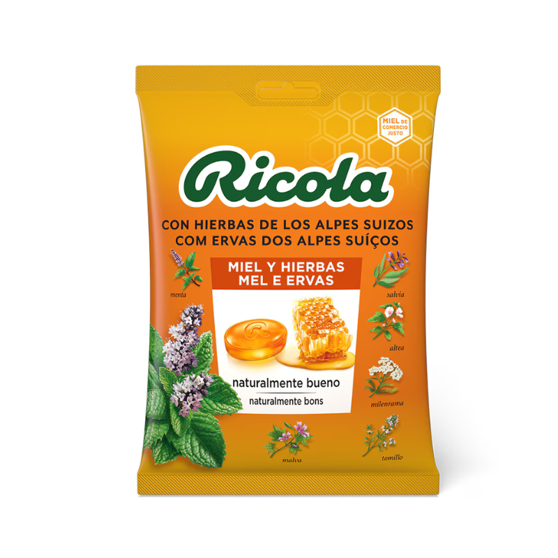 Ricola Rebuçados Mel e Ervas 50g sem açúcar, têm um efeito balsâmico e refrescante, aliviando as vias respiratórias e a garganta.