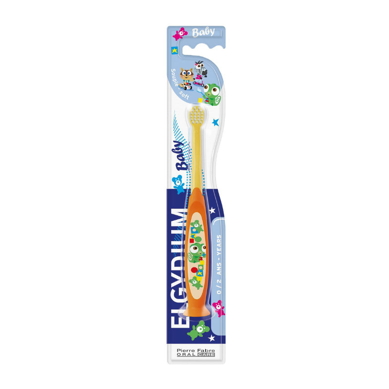 Elgydium Baby Escova de Dentes é uma escova de dentes para crianças até aos 2 anos, possui uma cabeça pequena, cabo longo para alcançar facilmente todos os pontos e cerdas suaves para uma escovagem delicada.