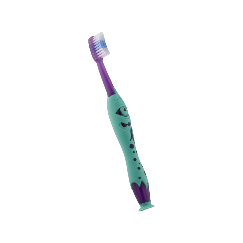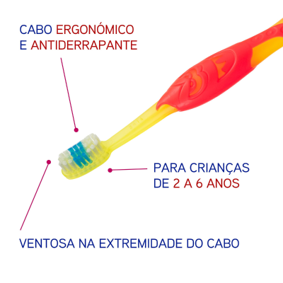 - O design inclui cerdas coloridas para ajudar as crianças a usar a quantidade certa de pasta dentífrica;