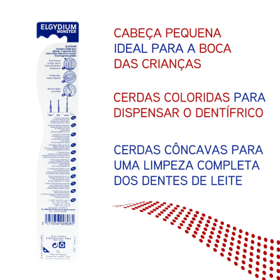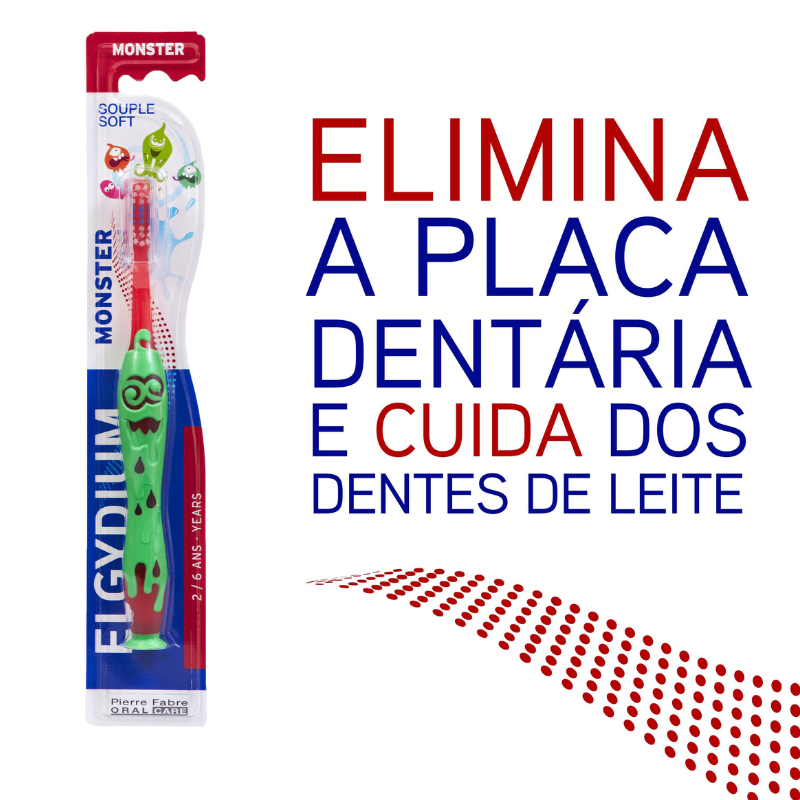 A escova ELGYDIUM Kids Monster desenvolvida para as crianças entre os 2 e os 6 anos, tem cabo ergonómico, cerdas de nylon, flexíveis e arredondadas, suaves para os dentes de leite e gengivas.