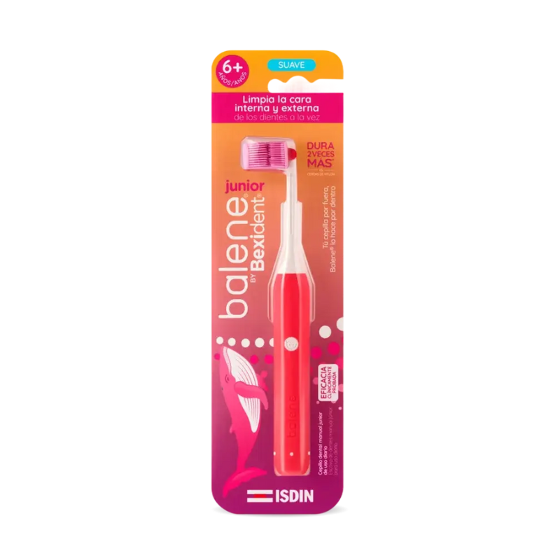 Balene by Bexident Junior Escova de Dentes ajuda a remover eficazmente a placa bacteriana e protege os dentes e as gengivas graças aos seus filamentos de nova geração.