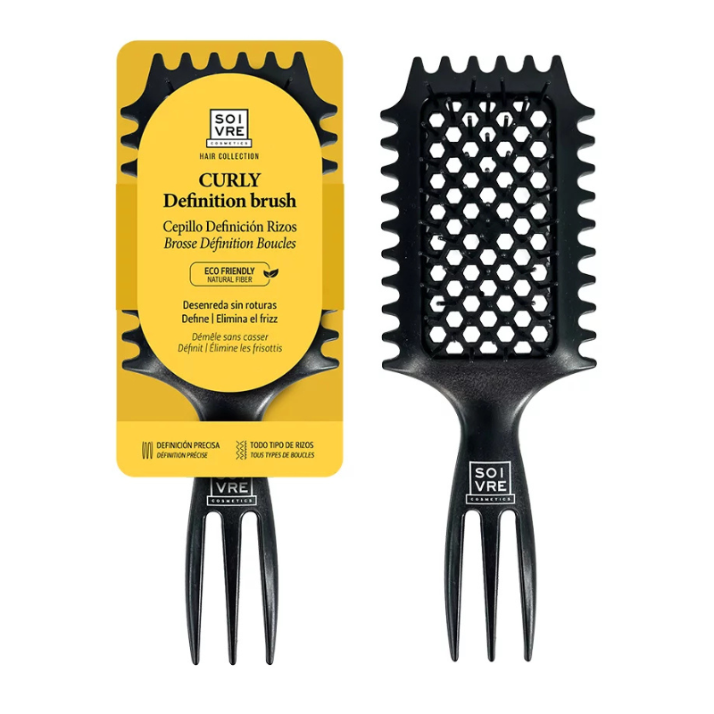 Escova para definição de caracóis. Desembaraça, previne a quebra e o repuxamento sem quebrar os caracóis, graças às suas cerdas flexíveis, separadas e macias.
