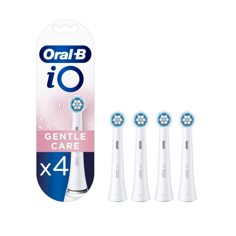 Oral-B iO Gentle Care são compostas por quatro recargas com cerdas suaves para uma limpeza delicada e eficaz. Compatíveis com a escova elétrica cor branca.