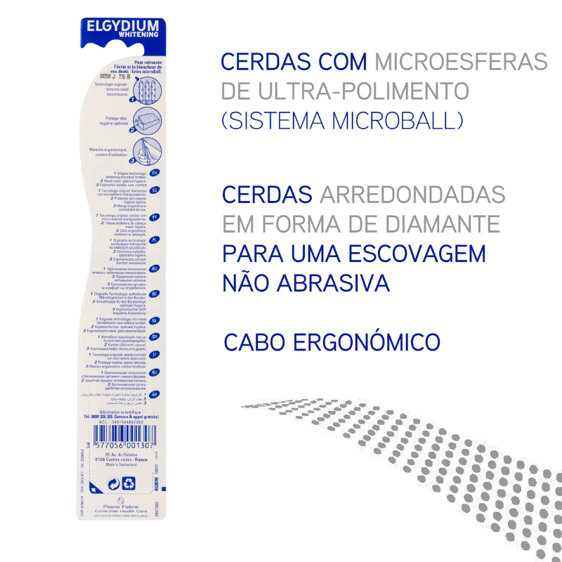 - O cabo ergonómico garante um manuseio perfeito durante a escovagem, ideal para uso três vezes ao dia com a pasta dentífrica ELGYDIUM Branqueamento.