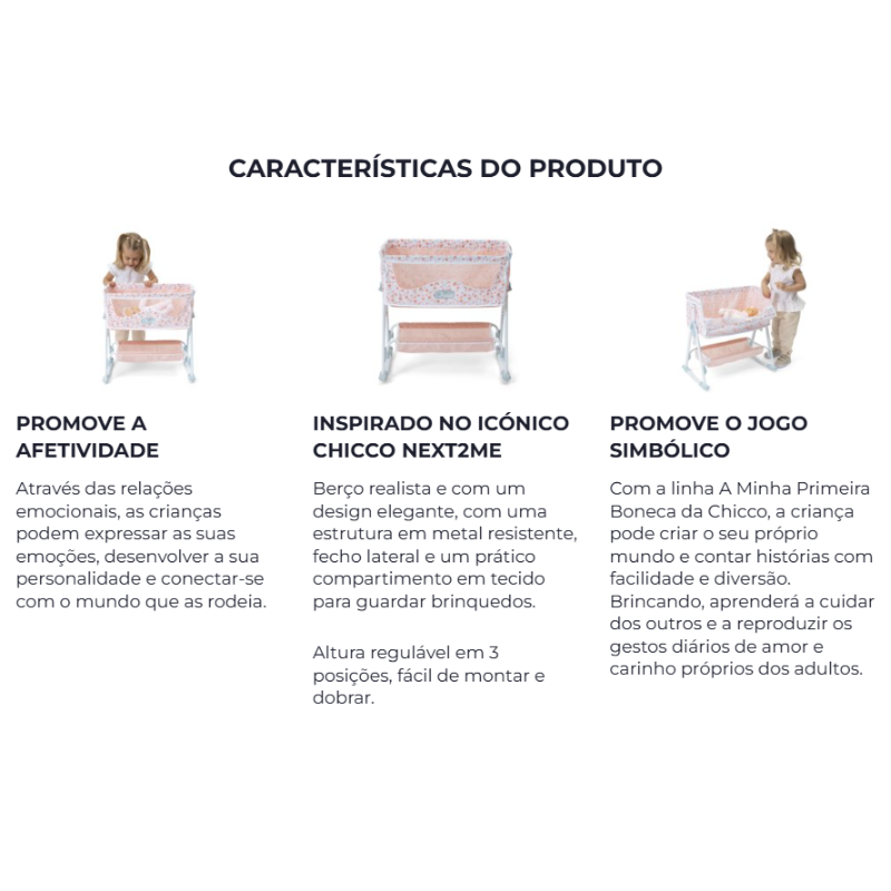 O Chicco Next2Me é um berço de brincar inovador, inspirado no conceito de berços coleira reais, que permite às crianças recriarem situações do dia a dia e desenvolverem competências emocionais através do jogo simbólico. Boneca não incluída.