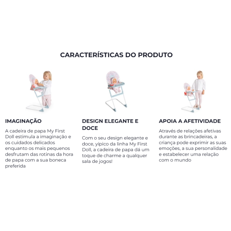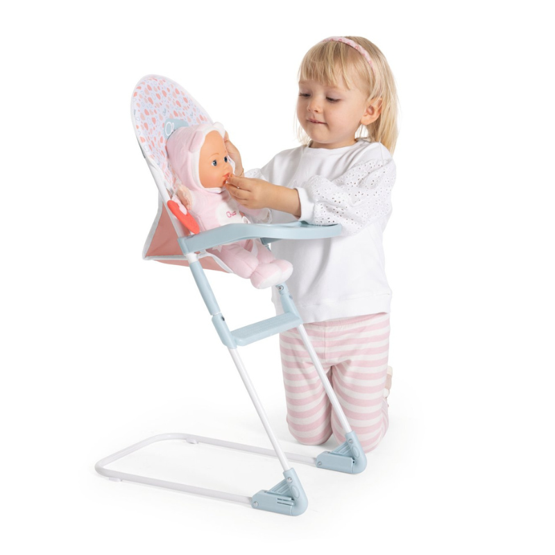 Esta cadeira de papa, integrada na linha My First Doll, foi concebida para enriquecer o universo do brincar simbólico. Com um design detalhado e funcional, permite às crianças recriarem momentos do dia a dia, como a hora da refeição, de forma realista e envolvente.