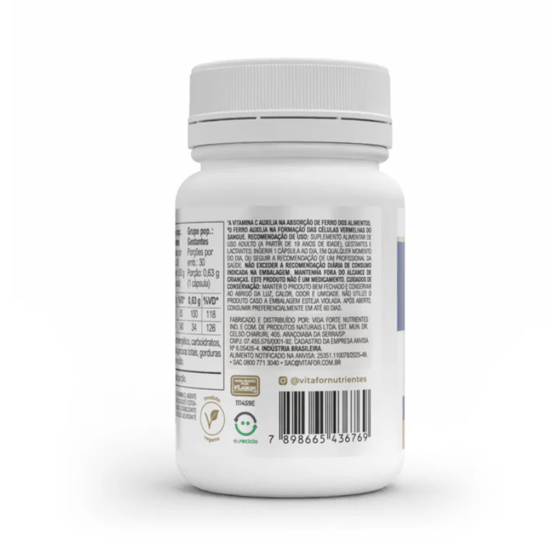 Suplemento de ferro bisglicinato com vitamina C. Alta biodisponibilidade, reduz cansaço e apoia função imunitária. 30 cápsulas.