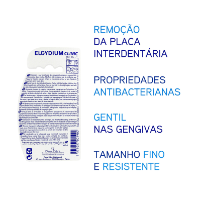 O fio dentário Elgydium Clinic, fino, forte e encerado, é impregnado com clorexidina, um ingrediente purificante que ajuda a proteger contra cáries.