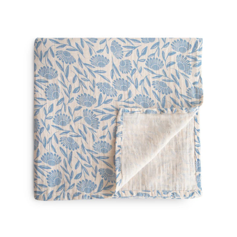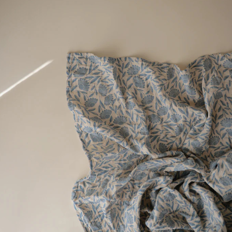 Pano musselina 120x120cm em algodão orgânico, padrão Blue Flowers. Extra suave, respirável e versátil. Ideal para envolver, amamentar ou como manta de atividades.